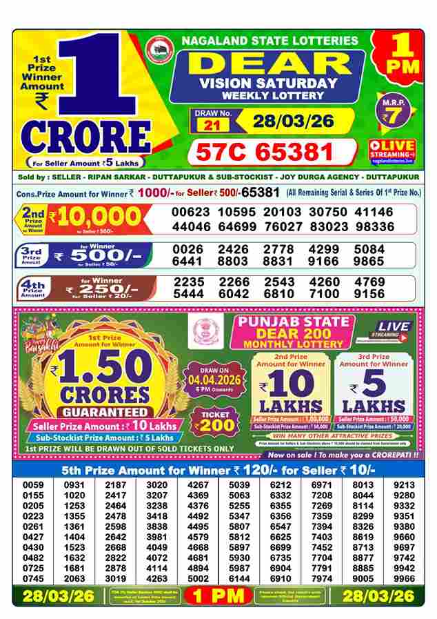Today’s Nagaland State Lottery Result March 28, 2026 for Dear Morning, Dear Day & Dear Night
